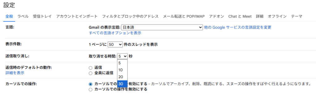 実はGmailには、この「取り消し有効時間」を最大30秒まで延長できる設定があるのをご存知でしょうか? デフォルトの「5秒」では反応できなくても、「30秒」あれば人間は冷静に対処できます。